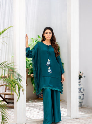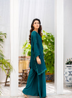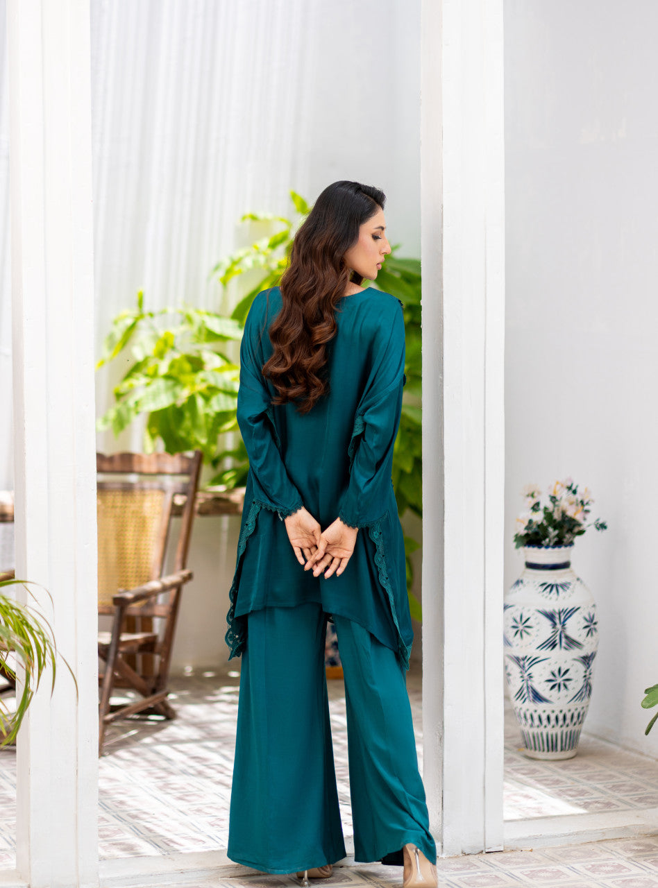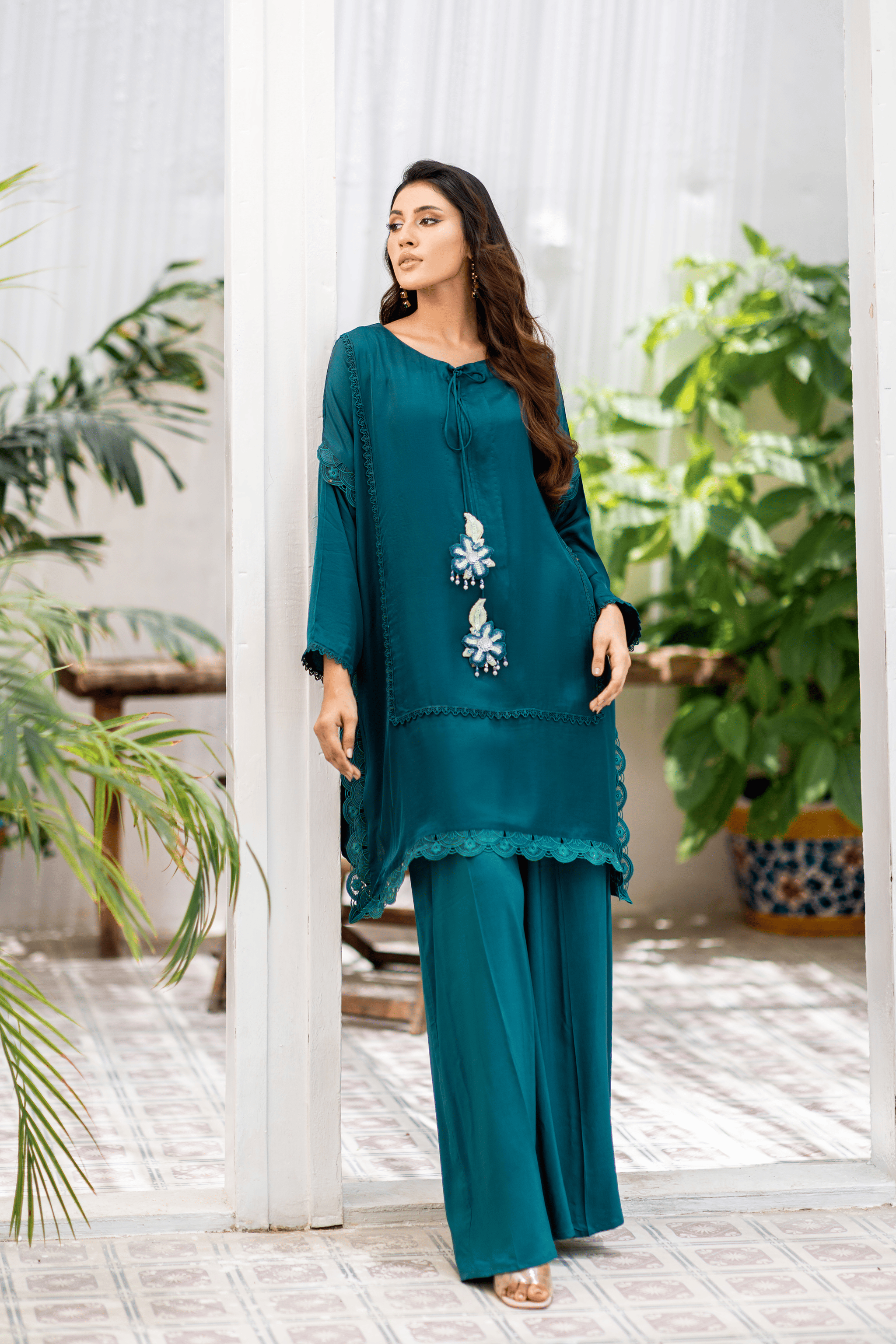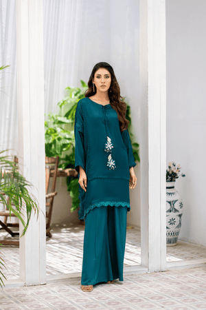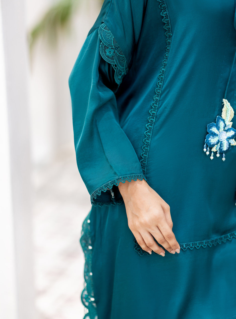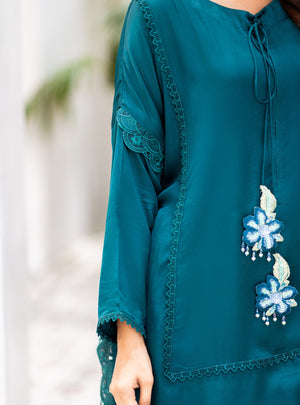 A rich teal silk outfit featuring delicate floral embellishments and lace detailing along the sleeves and shirt hem. The soft, flowy cut paired with wide-leg silk pants makes it both elegant and comfortable.