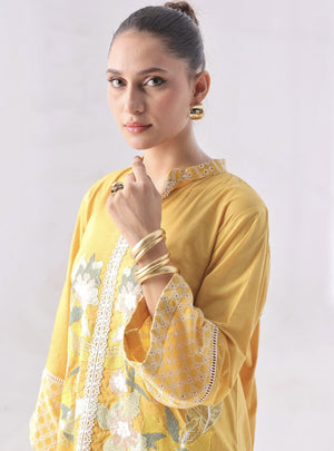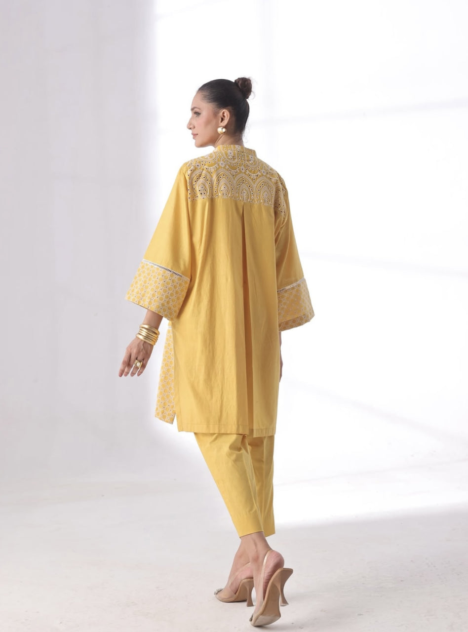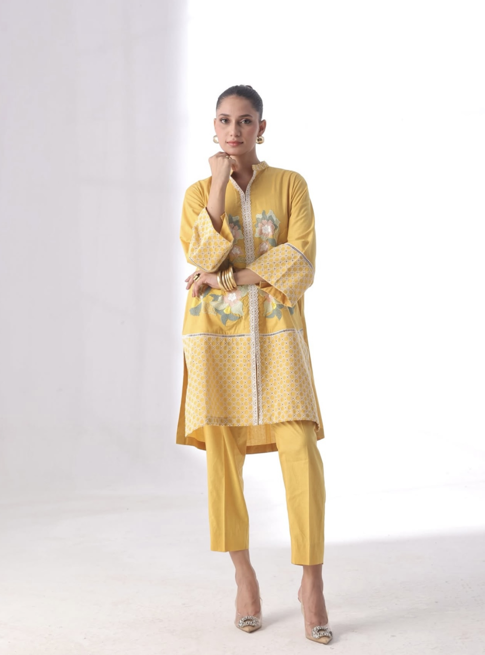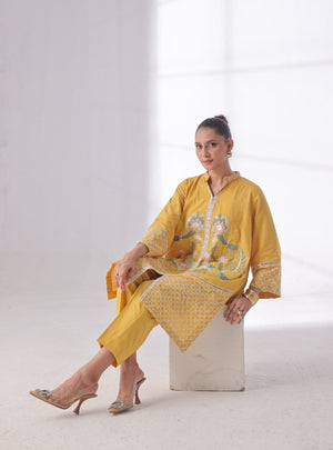 A warm mustard-yellow outfit crafted in soft Cotton and delicate Chikan fabric, featuring a kurta with floral embroidery and block patterns on the sleeves and hem. Paired with sleek tapered pants for a clean, coordinated look.