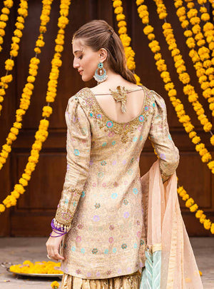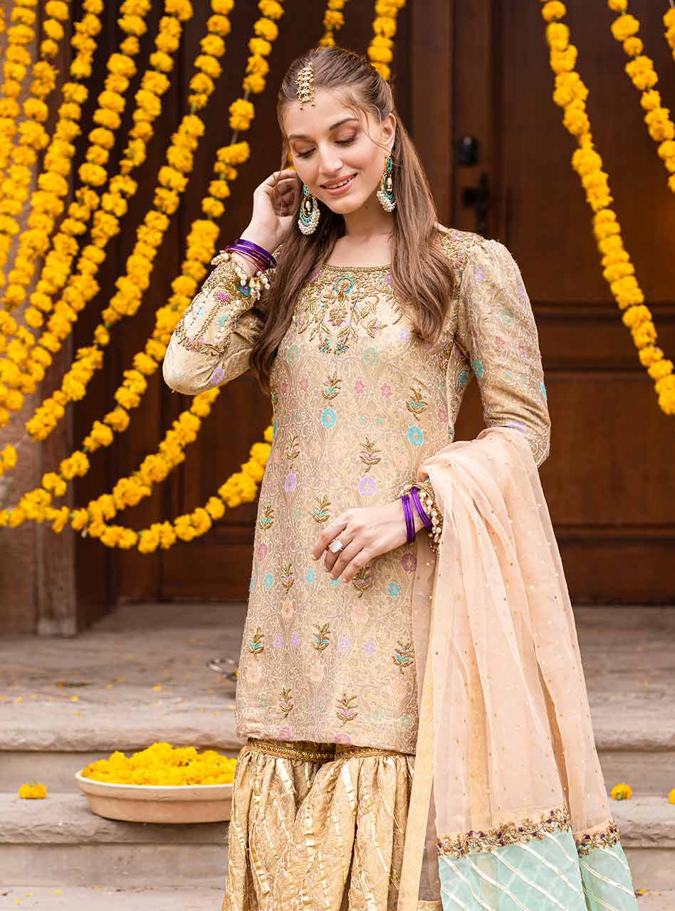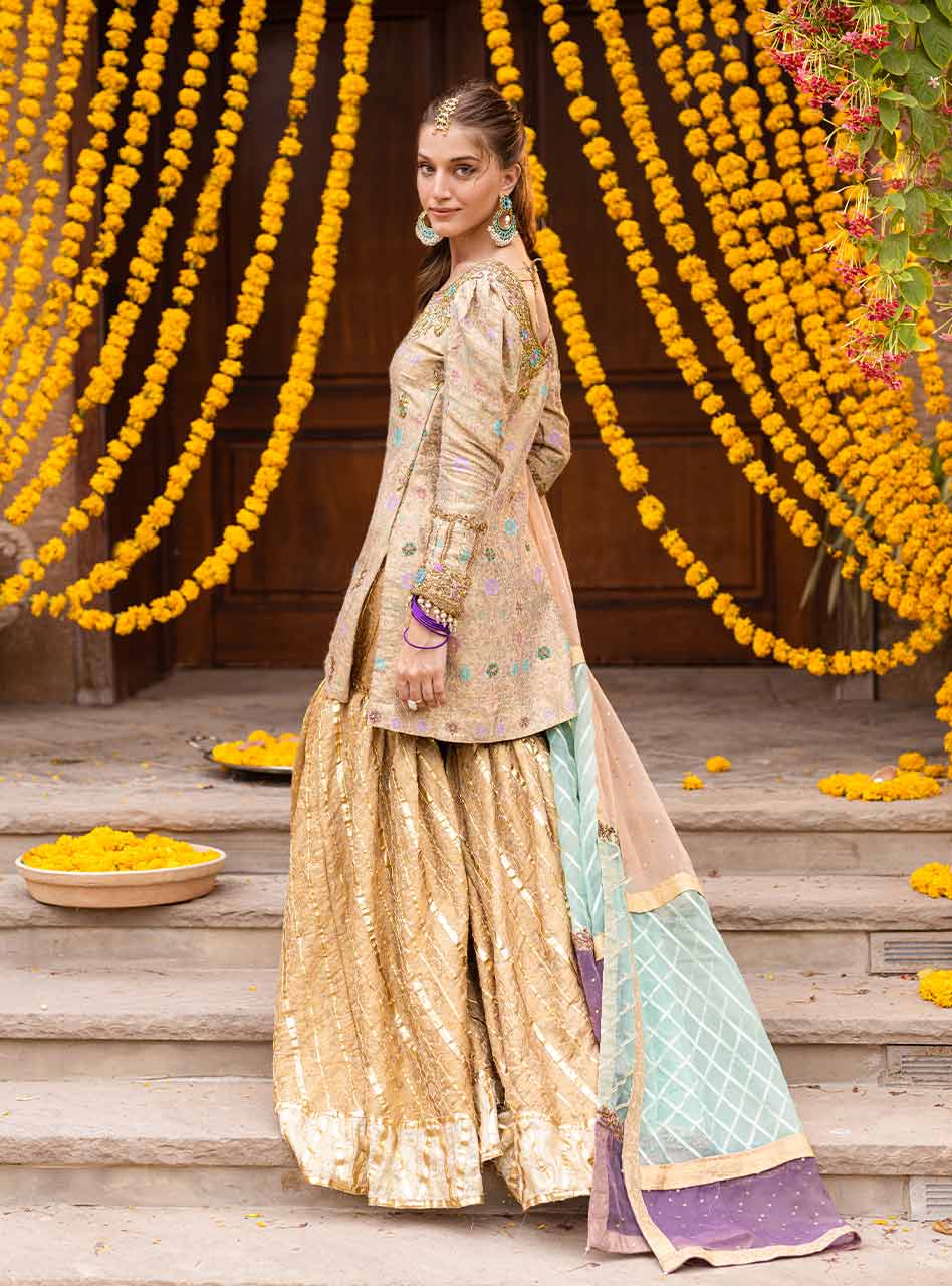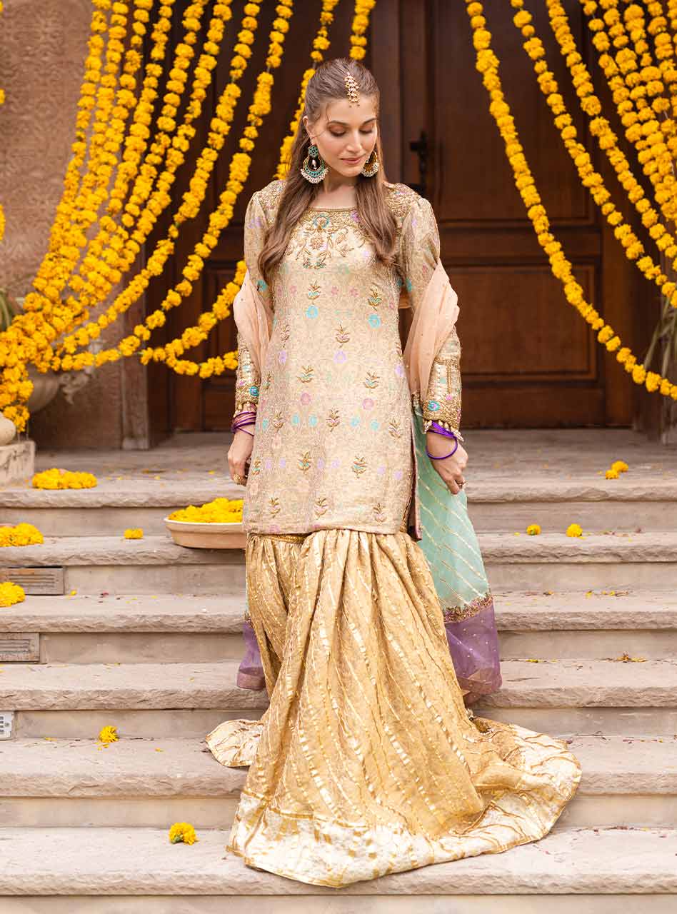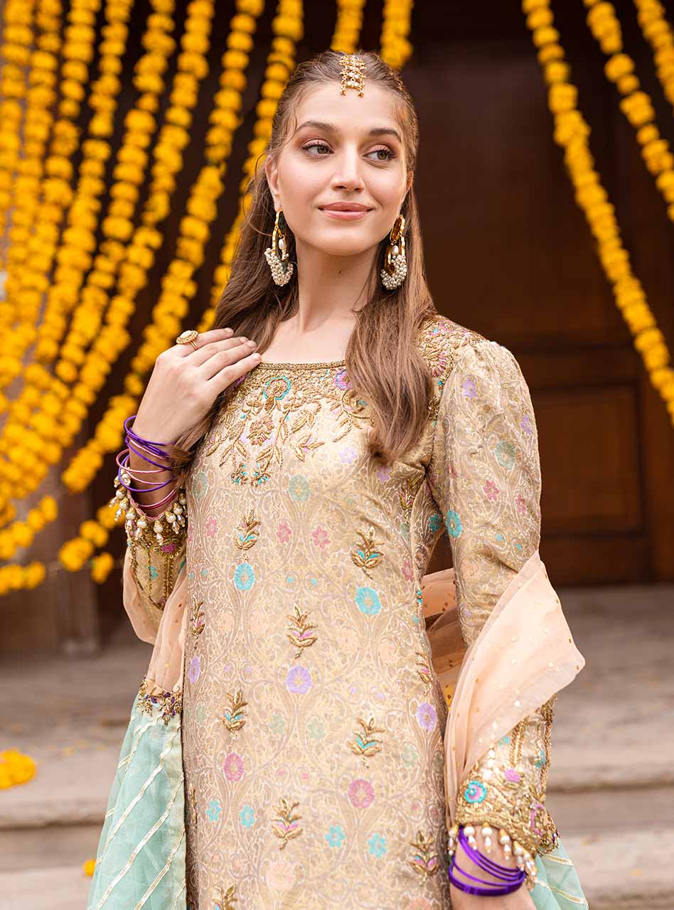 "Introducing the gleaming gold lehenga from our NOOR festive collection. This ensemble boasts a jamawar shirt with kaam, puff sleeves, and a stunning three-shade organza dupatta with intricate kaam and gota work. The golden lehenga, with off-white borders, gota stripes, and geometric patterns, is a true masterpiece” (The shirt pattern will slightly differ according to the availability in the market)